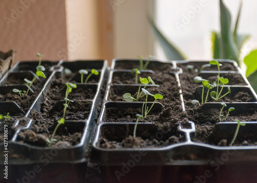 plastic plant boxes with earth and the first flower sprouts, blurred background, plant growing in spring for the garden