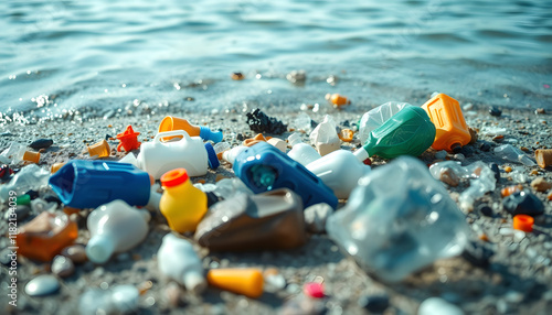 Plastic pollution at the sea. Plastic waste at the sea. Several plastic waste at the beach, studio lighting, with white tones