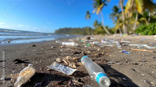 Plastic Pollution Crisis on Tropical Beach: Troubling Scene of Waste Including Bottles and Debris on the Shoreline with Beautiful Blue Sky and Palm Trees