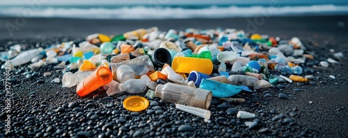 Plastic pollution idea. A beach covered with plastic waste highlighting the pollution crisis threatening nature.