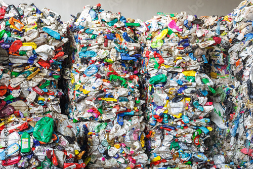 Plastic pressed bales at the modern waste hazardous processing plant. Separate garbage collection. Recycling and storage of waste for further disposal. Business for sorting and processing of waste.