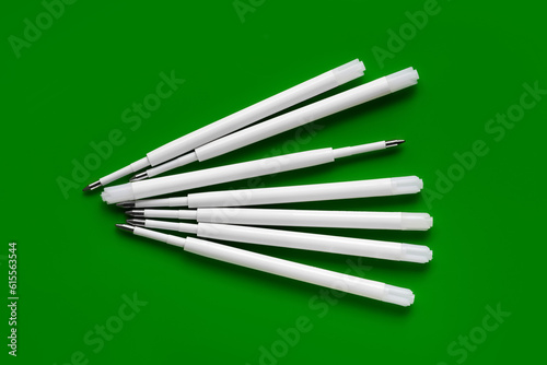 Plastic rods for a ballpoint pen. Ballpoint pen refills. White ink refills on a green