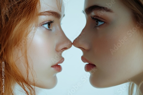 Plastic surgery and beauty concept. Profile shot of woman consulting before rhinoplasty operation, surgeon touching woman nose, white background, side