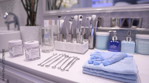 Plastic surgery instruments on surgical table, Surgical gloves and tools ready for a cosmetic procedure, sterile and professional setup