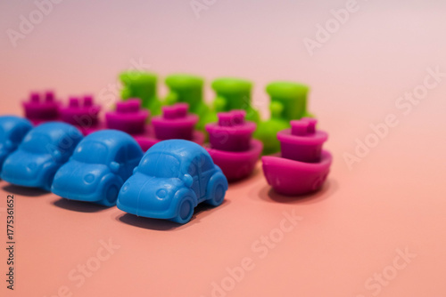 Plastic toy locomotive with wagons arranged by color on soft gradient