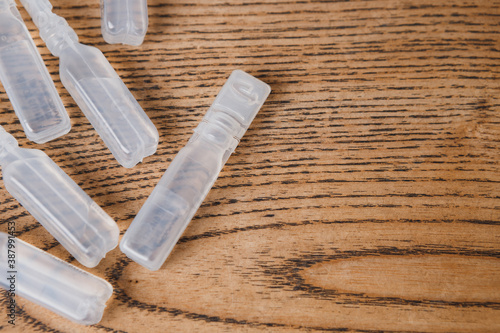 plastic transparent ampoules with liquid medicine on wooden background, copy space