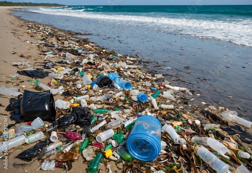 Plastic waste accumulating on a polluted beach, ocean background, stark contrast