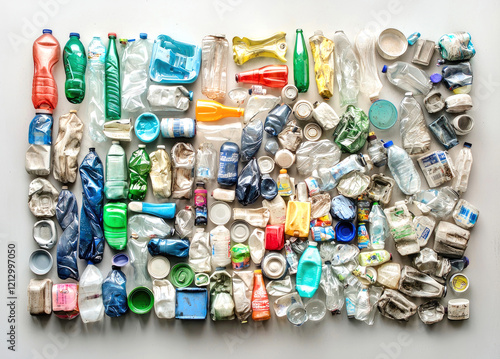 Plastic Waste Collage: A stark and unsettling visual of plastic waste, arranged in a grid pattern against a minimalist background.