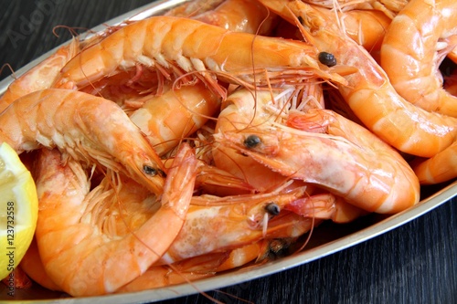 plat de grosses crevettes roses et citron