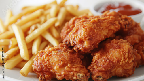 Plate of crispy fried chicken wings served with golden fries and side of dipping sauce, perfect for delicious meal