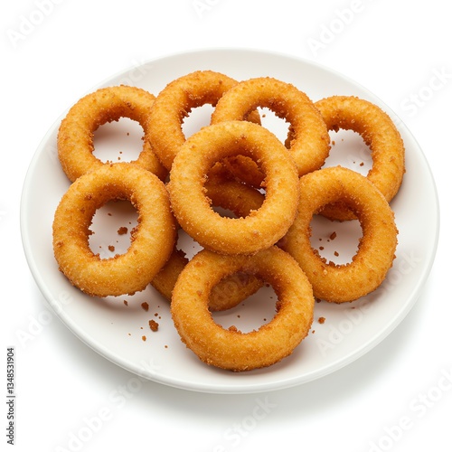 Plate of Crispy Golden Onion Rings, A Classic Crunchy Snack, Isolated on White Background