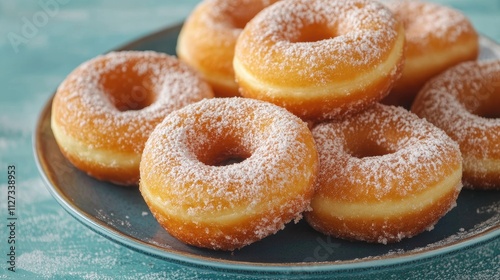 Plate of delicious sugar-dusted donuts arranged on a vibrant colored background perfect for bakery or dessert promotions.