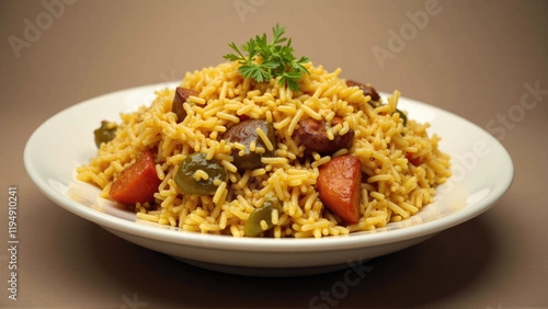Plate of flavorful rice with vegetables and spices served in a white bowl on a simple background