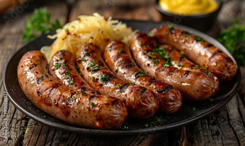 Plate of grilled sausages served with tangy sauerkraut and mustard on a rustic wooden table at the Oktoberfest festival.