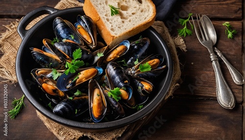 Plate of mussels on a wooden background.