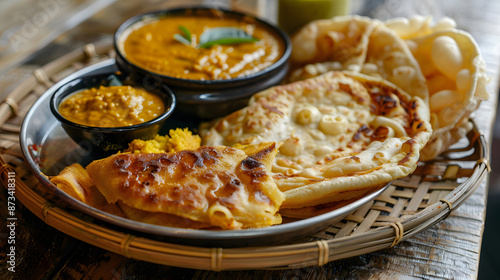 Plate of Roti Canai with dhal curry and spicy sambal, crispy and golden