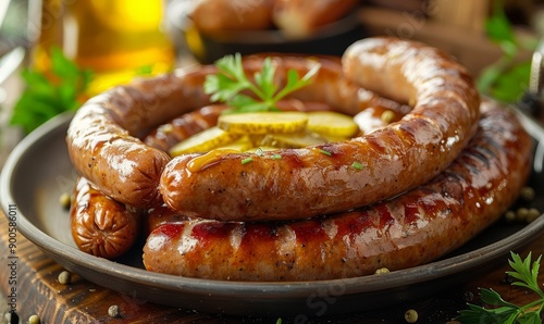 Plate of sausages with mustard and pickles at the Oktoberfest festival.