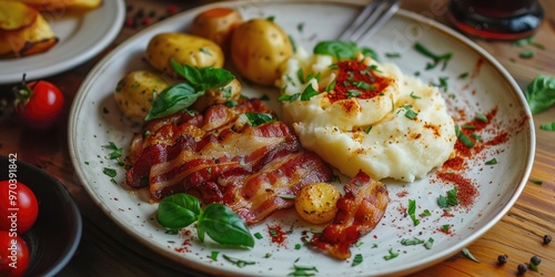 Plate with fried bacon mashed potatoes and basil rolls on a table