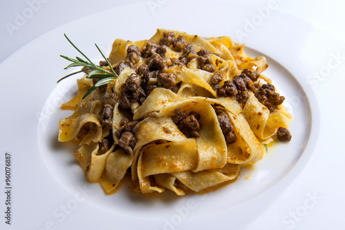 Plate with pappardelle with wild boar ragout sauce and rosemary