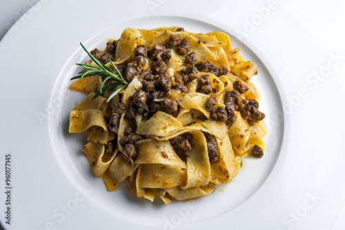 Plate with pappardelle with wild boar ragout sauce and rosemary