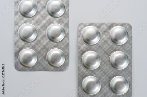 Plate with round medical pills silver color close-up shot