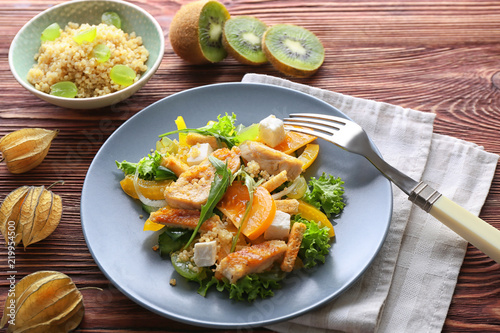 Plate with tasty chicken salad on wooden table