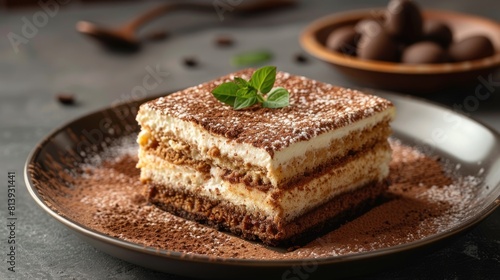 Plate with tasty tiramisu cake with mint leaf on table, closeup