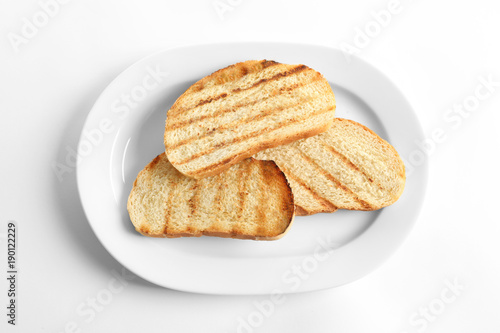 Plate with toasted bread on white background