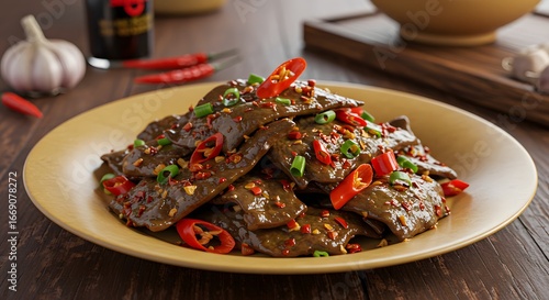"Plato Hati Buyah plato nacional de Brunéi hígado de res sazonado con guarnición de chiles"