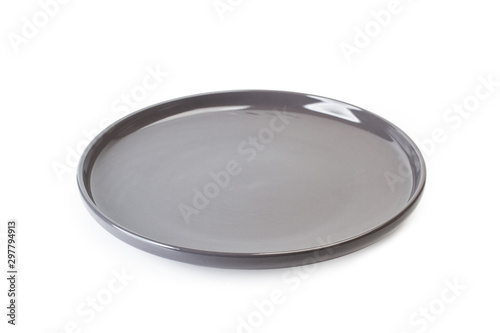 Plato redondo gris sobre fondo blanco aislado vista de frente