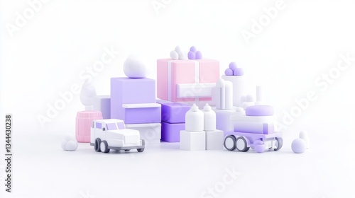 Playful 3D shapes in pastel colors. A collection of colorful, geometric forms. Gift boxes, vehicles, and decorative elements combine in a charming design