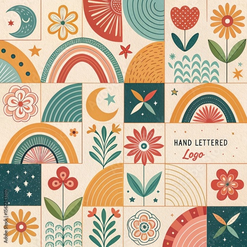 “Playful Abstract Geometric Pattern with Retro Shapes and Colorful Elements – Mid-Century Modern Style Design”