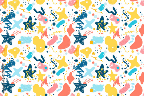 Playful abstract shapes in pastel colors on a white background. This seamless pattern is perfect for whimsical and creative-themed decor.