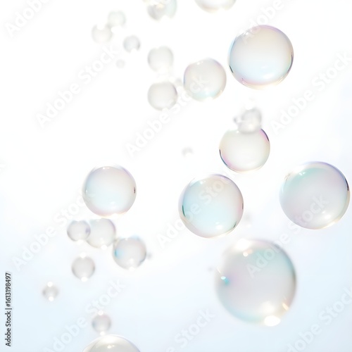 Playful and delicate soap bubbles with colorful iridescent sheen floating up high against a bright white background