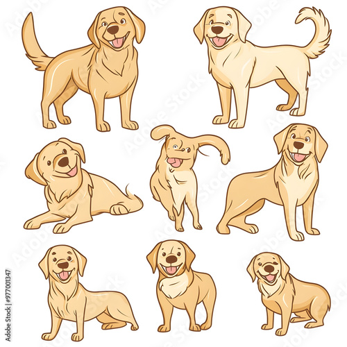 Playful and happy golden retrievers with wagging tails in a simple and pastel colored