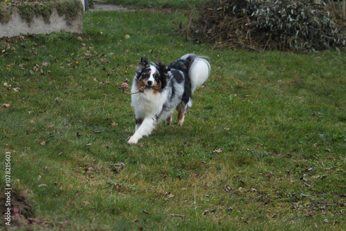 playful australian shepherd blue merle running in the green autumn garden with a toy
