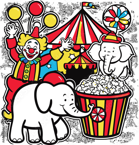 Playful bold cartoon circus doodle, juggling clown, circus elephant on ball, candy popcorn bucket, carnival tent, thick outline line art vector