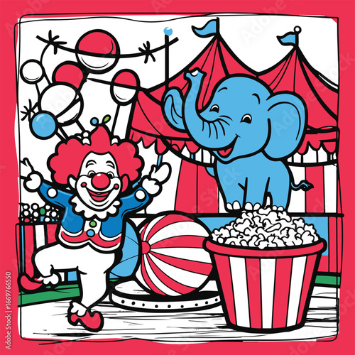 Playful bold cartoon circus doodle, juggling clown, circus elephant on ball, candy popcorn bucket, carnival tent, thick outline line art vector 2