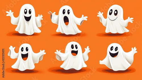 Playful cartoon ghosts expressing various emotions on an orange background.