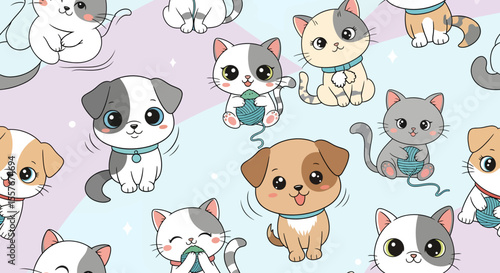 Playful Cartoon Kittens and Puppies Pattern with Yarn Balls and Pastel Colors.