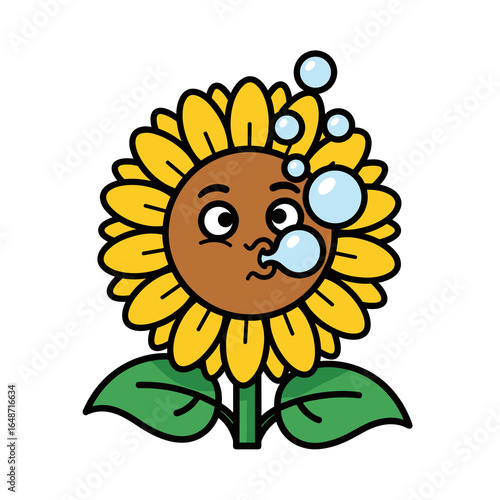 Playful Cartoon Sunflower Character Blowing Bubbles
