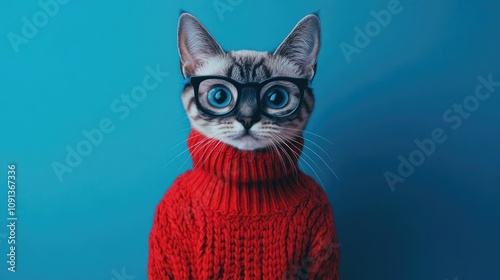 Playful cat in glasses and a cozy red sweater against a bright blue background, showcasing a whimsical and humorous animal theme.