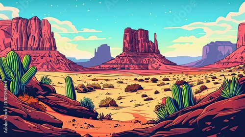 Playful desert plateau scene with exaggerated rocks and sand patterns under a bright sky perfect for text
