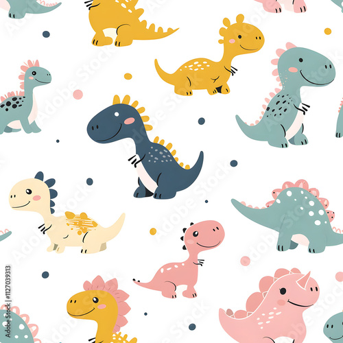 Playful dinosaurs and leaves in soft colors, seamless pattern, white background, concept of whimsical kid-friendly design