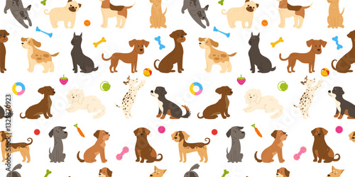 Playful dogs with dog toys seamless pattern. Cute Dogs cartoon childish dogs breeds boundless background. Funny Puppy in various poses playing sitting, standing endless template. Pet animals vector