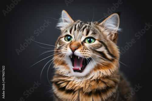 Playful Domestic Cat with Bright Green Eyes in a Charming Pose Against a Dark Background