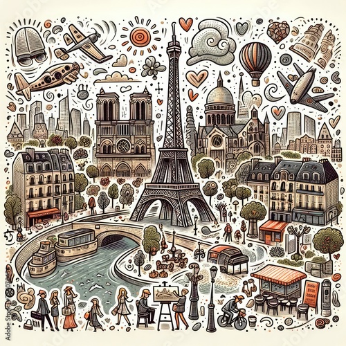 playful doodle drawing of France, highlighting its iconic landmarks and vibrant street life with a whimsical touch