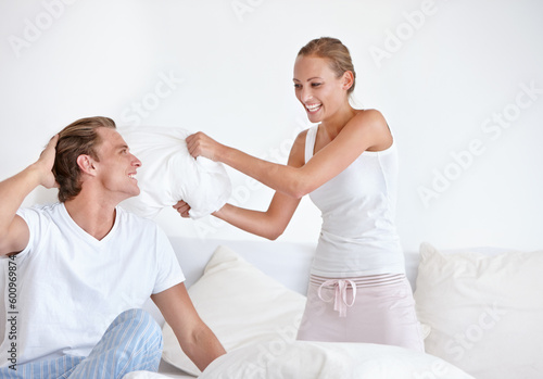 Playful, energy and couple in a pillow fight on the bed in the hotel room on romantic weekend trip. Happiness, laughing and young woman and man playing together in the morning in the bedroom at home.