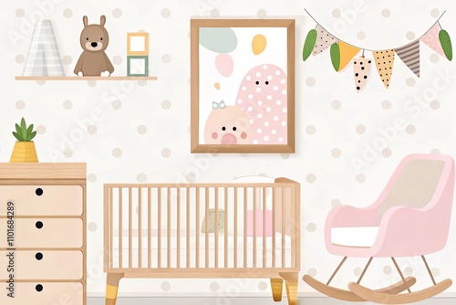 Playful flat design of a nursery room, framed mockup poster on the wall, baby toys and modern furniture