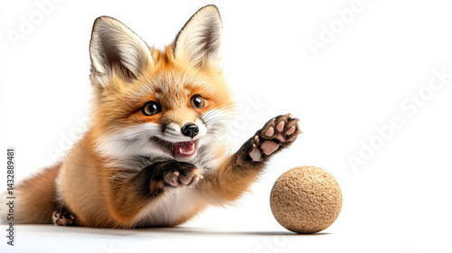 playful, fluffy fox with expressive eyes joyfully reaches for textured ball on white background, capturing moment of lively interaction and curiosity